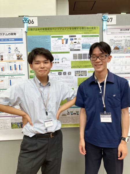 2人は「日焼け止めの有害成分ベンゾフェノンを分解する微生物の探索」という研究テーマで応募し、見事、最終審査会への進出を果たしました。会場ではポスター発表形式で研究内容を説明し、環境分野の多くの研究者の方々に熱心に聞いていただきました。積極的に研究者に話しかけ、質疑応答でも落ち着いて的確に答え、研究者の方々からは「高価な実験機器がない中でも、理科室でできることを工夫して調べたいことに挑戦している点に好感が持てる」といった評価やアドバイスをいただきました。