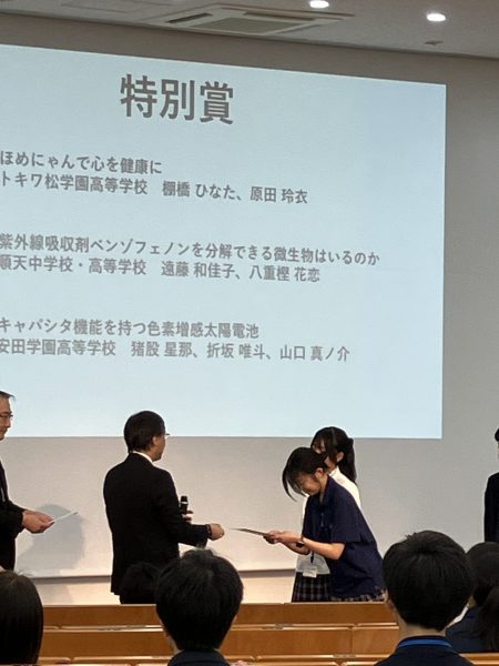 高1の 八重樫花恋さん と 遠藤和佳子さん の「ベンゾフェノン班」は、これまで高3の 武士田君・廣瀬君 たちが進めてきた研究を引き継ぎ、さらに自分たちなりの視点で探究を深めてきました。今回の研究会では、その成果が高く評価され、特別賞を受賞しました。