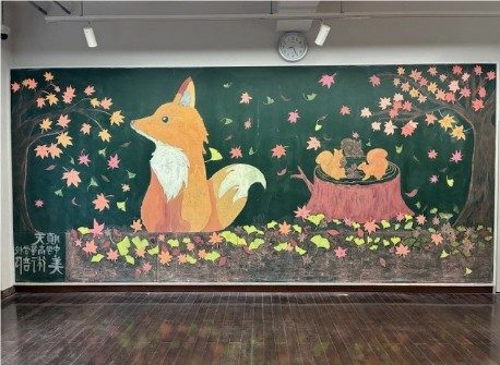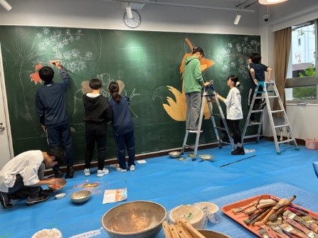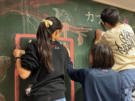 また、チョークの扱いが、日頃使い慣れている色鉛筆やアクリル絵の具と違い、色数が少ない上、重ね塗りの難しさに苦労していました。デジタルで描いた原案通りにはいかず、現場で試行錯誤しながら相当アレンジしての完成に至りました。