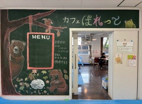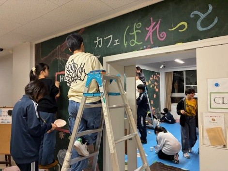 美術部では、北区文化財団ココキタの依頼により『カフェパレット』内と入口に10月19(日)・10月25日(土)・11月2日(日)の3日間で、黒板アート制作をしました。