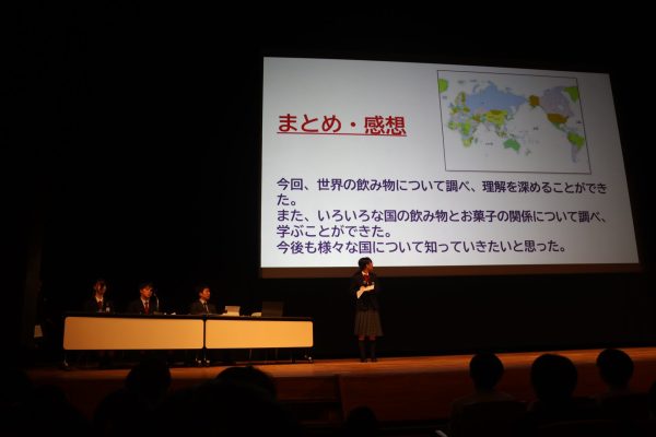 中1はそれに加えて、社会科の探究学習の発表をしました。自分で選んだテーマを表す世界地図を作り、地図の中心地とした場所とテーマの関連について調査する「私だけの世界地図」の優秀作品のプレゼンテーションでした。