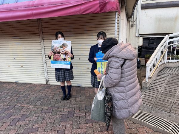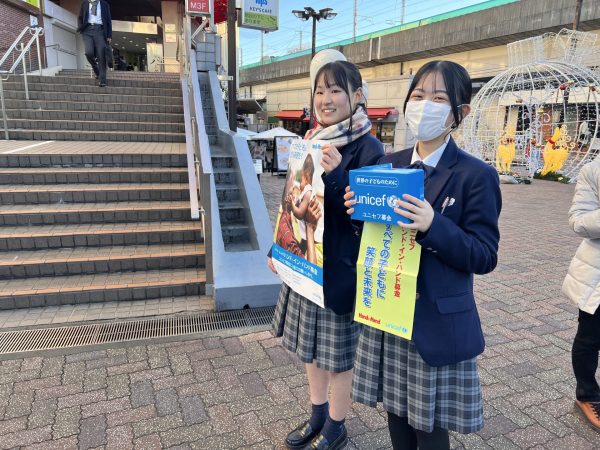 ユニセフの資料を手にした生徒たちは、自分たちの生活が当たり前でないことを実感した様子です。少しでも困難な状況にある子どもたちのためにと、一生懸命大きな声で呼びかけをしました。