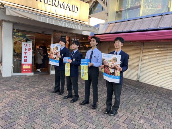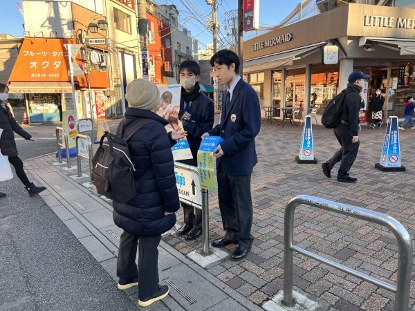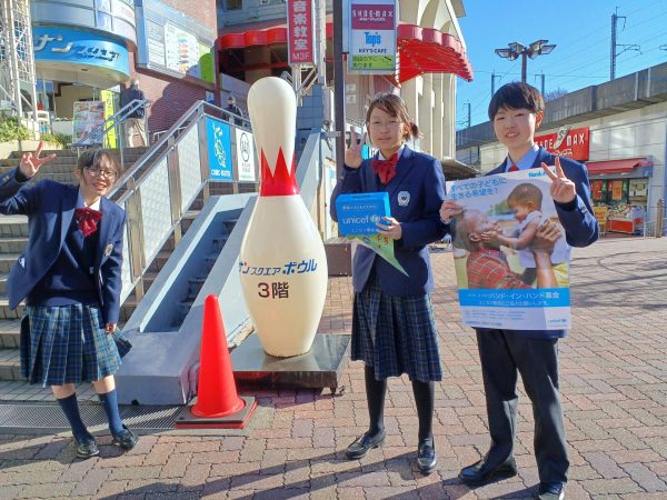 12月15日(月)、王子駅前のサンスクエア広場にて、第47回(2025年)ハンド・イン・ハンド募金を実施しました。社会福祉部の生徒と活動を希望した生徒を合わせて17名が参加しました。
