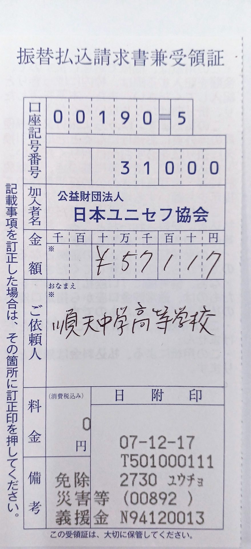 おかげさまで、¥57,117-をユニセフに募金することができました。