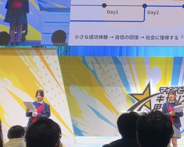 本校の高校2年生・高校1年生英語クラス生徒による2人組チーム「再花」が、「マイナビキャリア甲子園」決勝大会に出場しました。